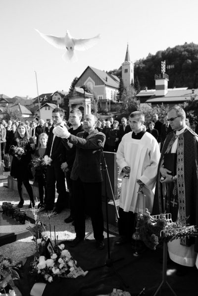 Ob verzih ali glasbi je izpuščen golob, ki simbolizira slovo pokojnega. Sledijo mu 3 golobi, ki predstavljajo Sveto trojico – Oče, Sin in Sveti duh.